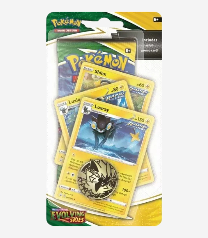 Celebrate the Evolving Skies expansion with the Premium Checklane Blister English Edition. Each blister contains 3 exclusive promo cards and 1 metallic coin, all packaged in a collectible blister featuring artwork from the Evolving Skies expansion.