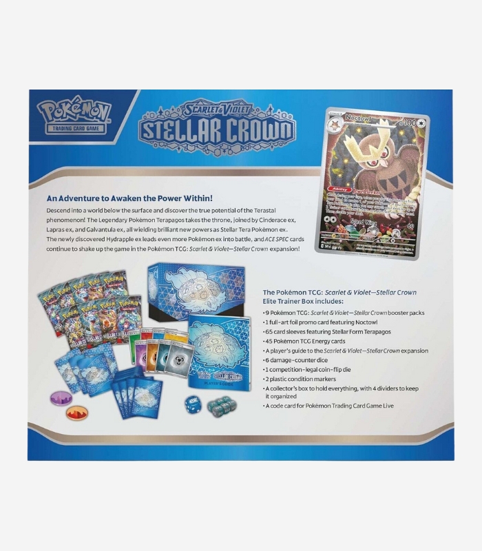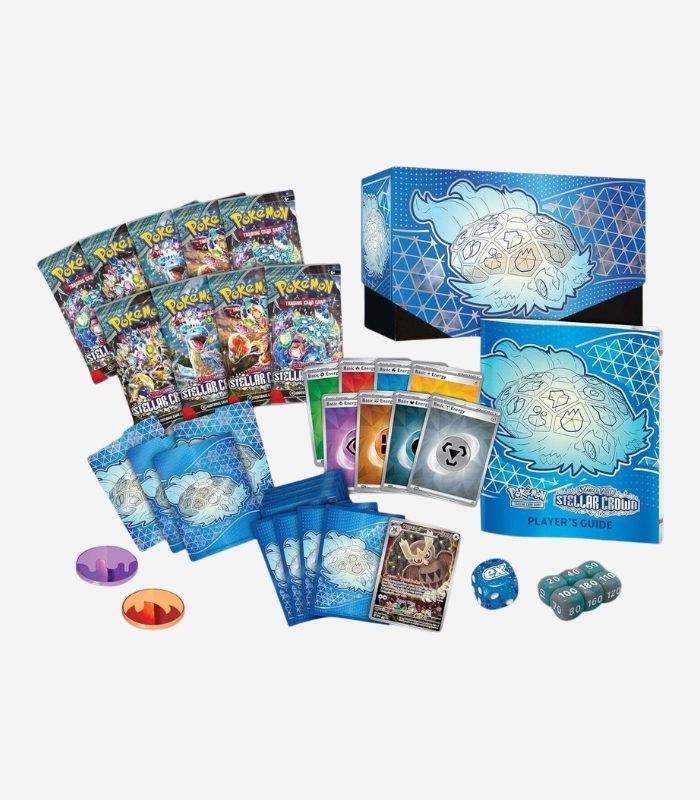 Discover the power of Terastal Pokémon with the Pokémon Stellar Crown Elite Trainer Box English Edition. Designed for collectors and players, this box provides everything you need to explore the Scarlet and Violet Stellar Crown expansion, build decks, and enhance your collection.